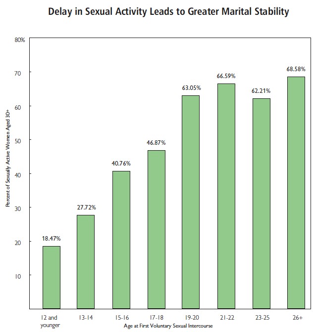 For example,in the bottom chart, of all the girls who were over 30 and sexually active and commenced sexual activity at 12 or less years of age only 18.47% were in a stable marriage. As opposed to the women over 30 who were sexually active and commenced sexual activity between 19-20 years of age, where 63.05% of that cohort of women were in a stable marriage.